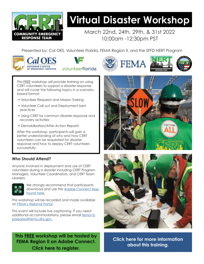 CERT Deployment Workshop and NCA Conference Info Posted bycamdensamMarch 11, 2022Posted inInformation, Training Opportunity cert-disaster-deployment-workshop-flyerDownload 2022-national-cert-conference-save-the-dateDownload Share this:Tweet Share on Reddit (Opens in new window) Reddit Share on TumblrPocket Print (Opens in new window) Print Email a link to a friend (Opens in new window) Email Like Loading... Related