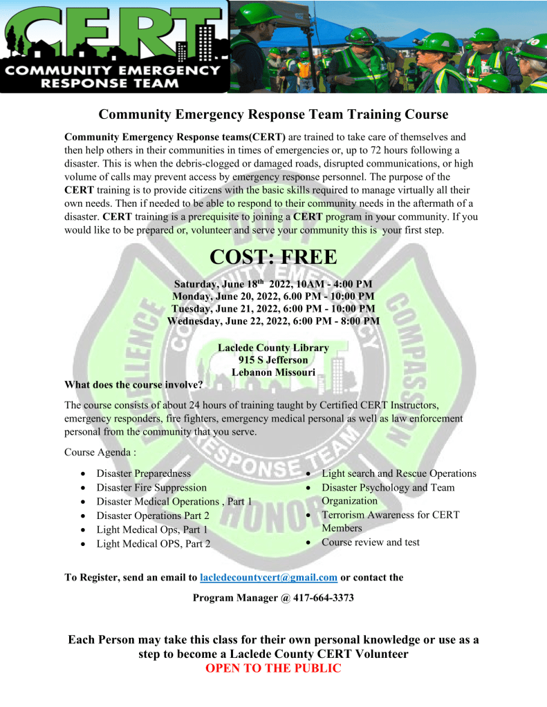 Upcoming Training Opportunity! Posted bycamdensamJune 15, 2022June 15, 2022Posted inTraining Opportunity 2022community-emergency-response-team-training-courseDownload Share this:Tweet Click to share on Reddit (Opens in new window) Reddit Share on TumblrPocket Click to print (Opens in new window) Print Click to email a link to a friend (Opens in new window) Email Like Loading... Related