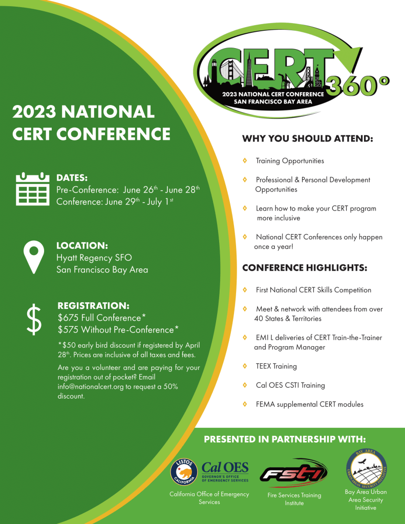 We invite you to join the 2023 CERT Conference Planning Team on Wednesday, March 15th for a webinar previewing details about the 2023 CERT Conference. Planning team members will give updates on scheduled pre-conference trainings and share some of the confirmed speakers scheduled for the main conference.