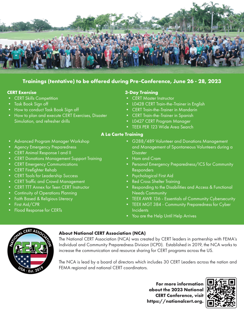 Attached is the flyer for the 2023 National CERT Conference. Please feel free to share this with your network as appropriate.